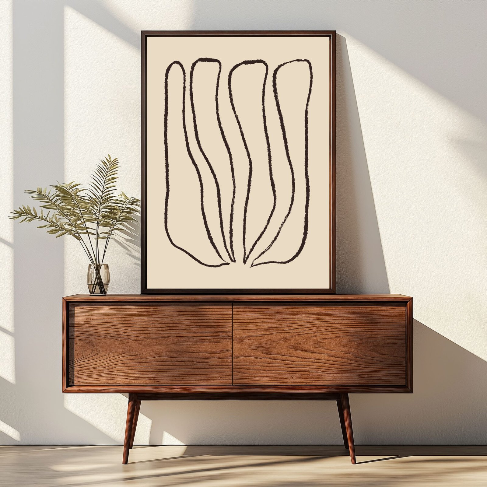 This abstract line art print is designed to bring a minimalist touch to your interior. Its soft, flowing lines create a calming effect, making it perfect for modern homes, offices, or living rooms. The neutral beige background enhances its subtle elegance.