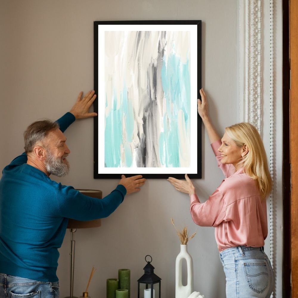 This dynamic brush stroke art print combines light blue and grey tones with expressive strokes, creating an atmosphere of movement and energy. The cool, soothing colours make it perfect for contemporary spaces that need a modern, yet calming art piece.