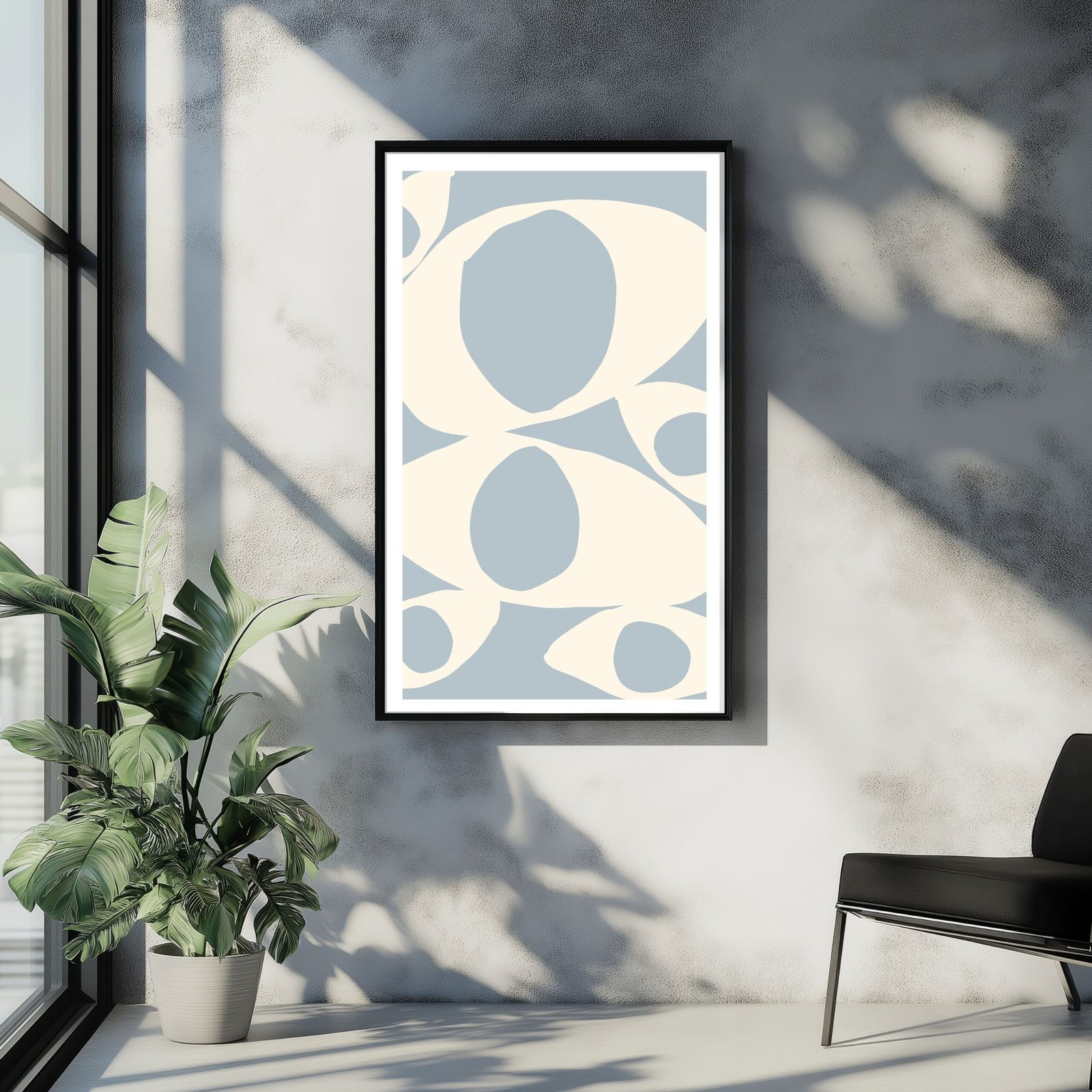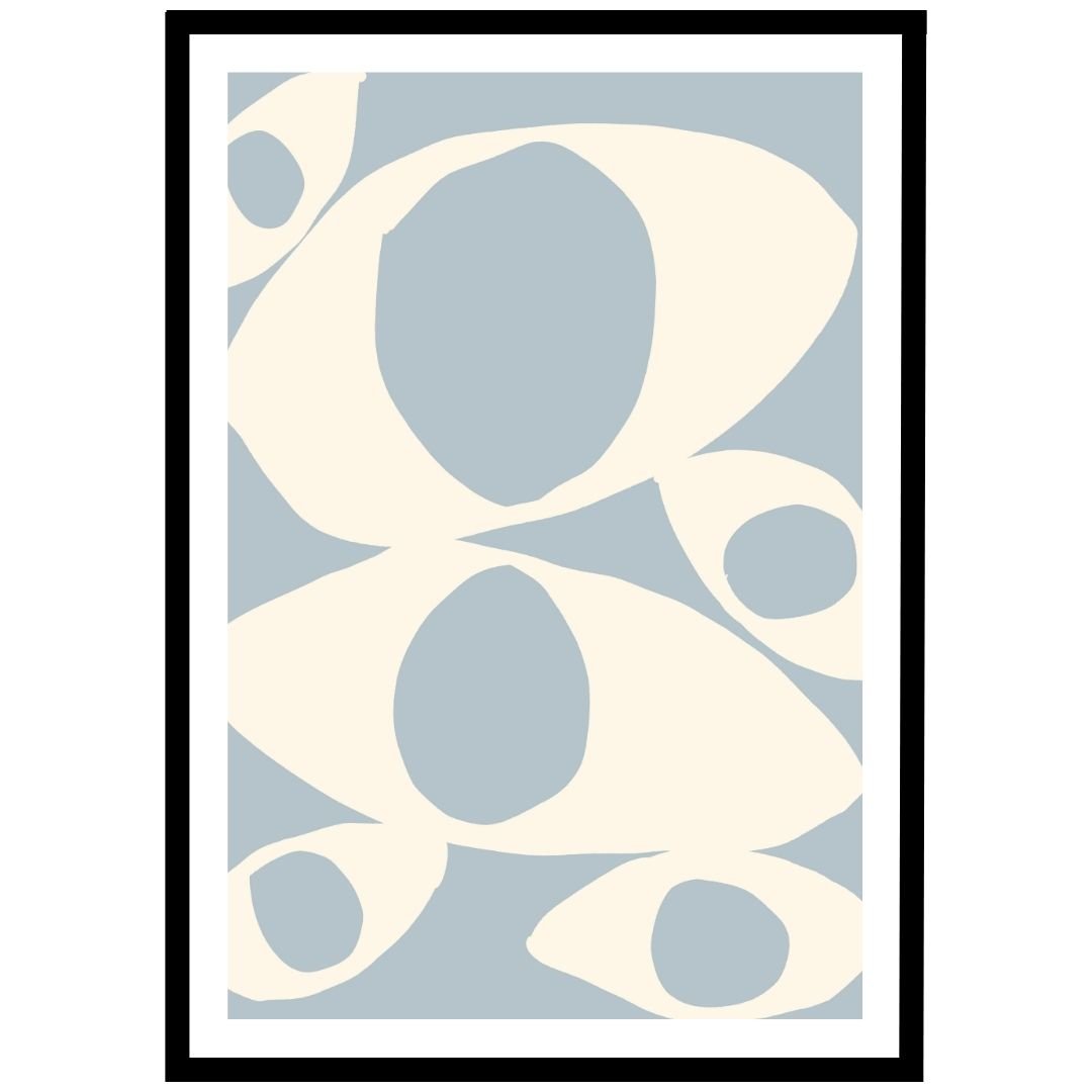 A modern abstract geometric print featuring delicate white shapes set against a calming blue background, a striking yet serene piece that brings balance and style to any space. The unique design and playful patterns make it perfect for adding a modern and artistic flair to any UK home.