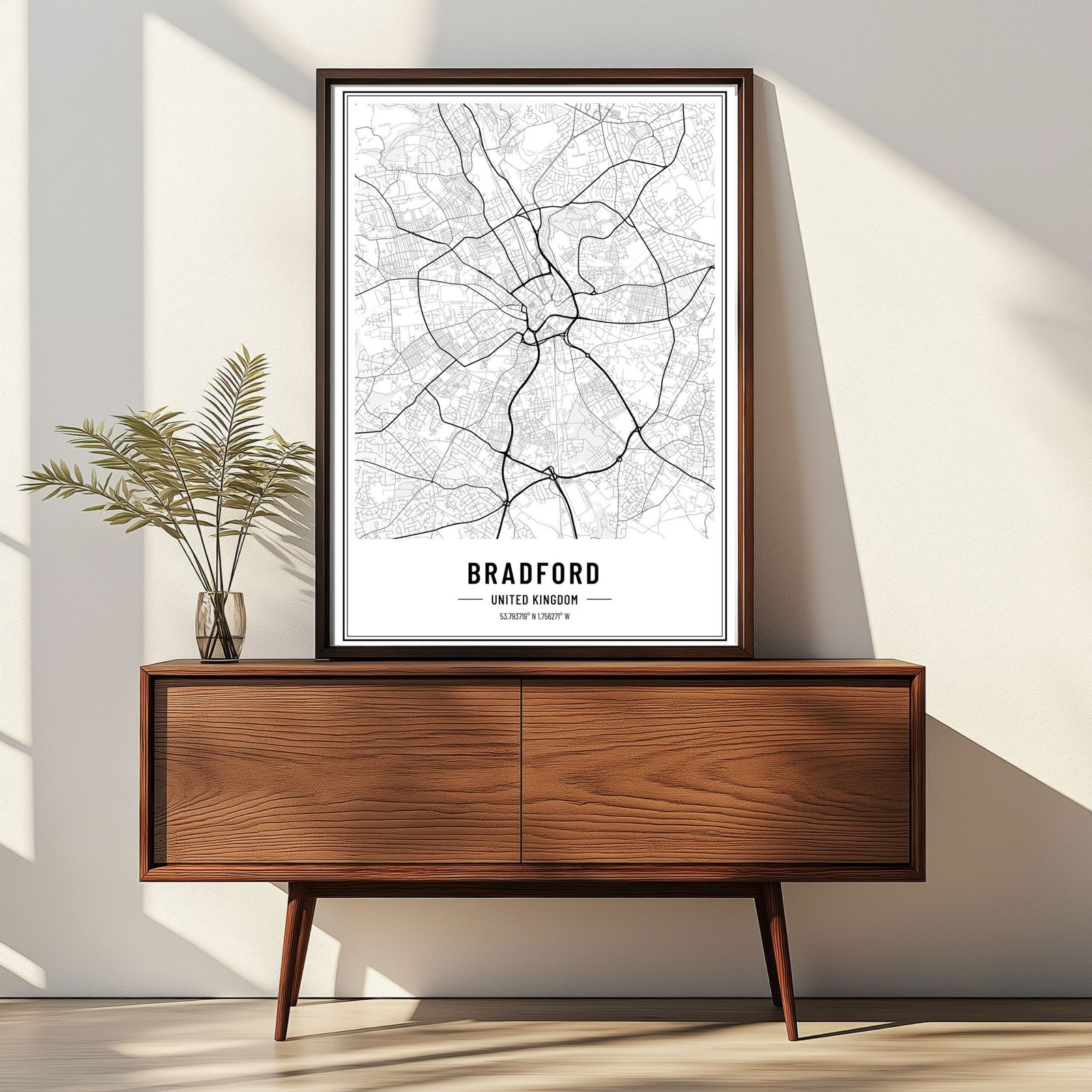 Celebrate the character and charm of West Yorkshire with this black and white map of Bradford. This beautifully detailed print captures Bradford’s streets, districts, and landmarks, presenting the city in a timeless monochrome design that feels both elegant and familiar. Its clean, minimalist style complements both modern interiors and more traditional décor, bringing a sense of place and personality to any room.