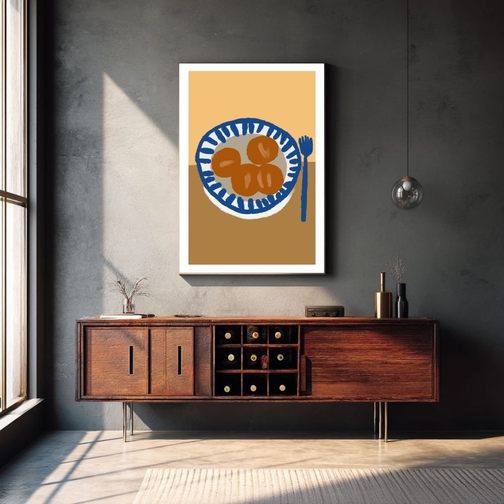 This minimalist poster captures a bowl of bread rolls, featuring a vibrant blue rim and warm earthy tones. It’s perfect for adding a warm, welcoming touch to kitchens or dining areas, especially for those who appreciate simple, yet striking, artwork.
