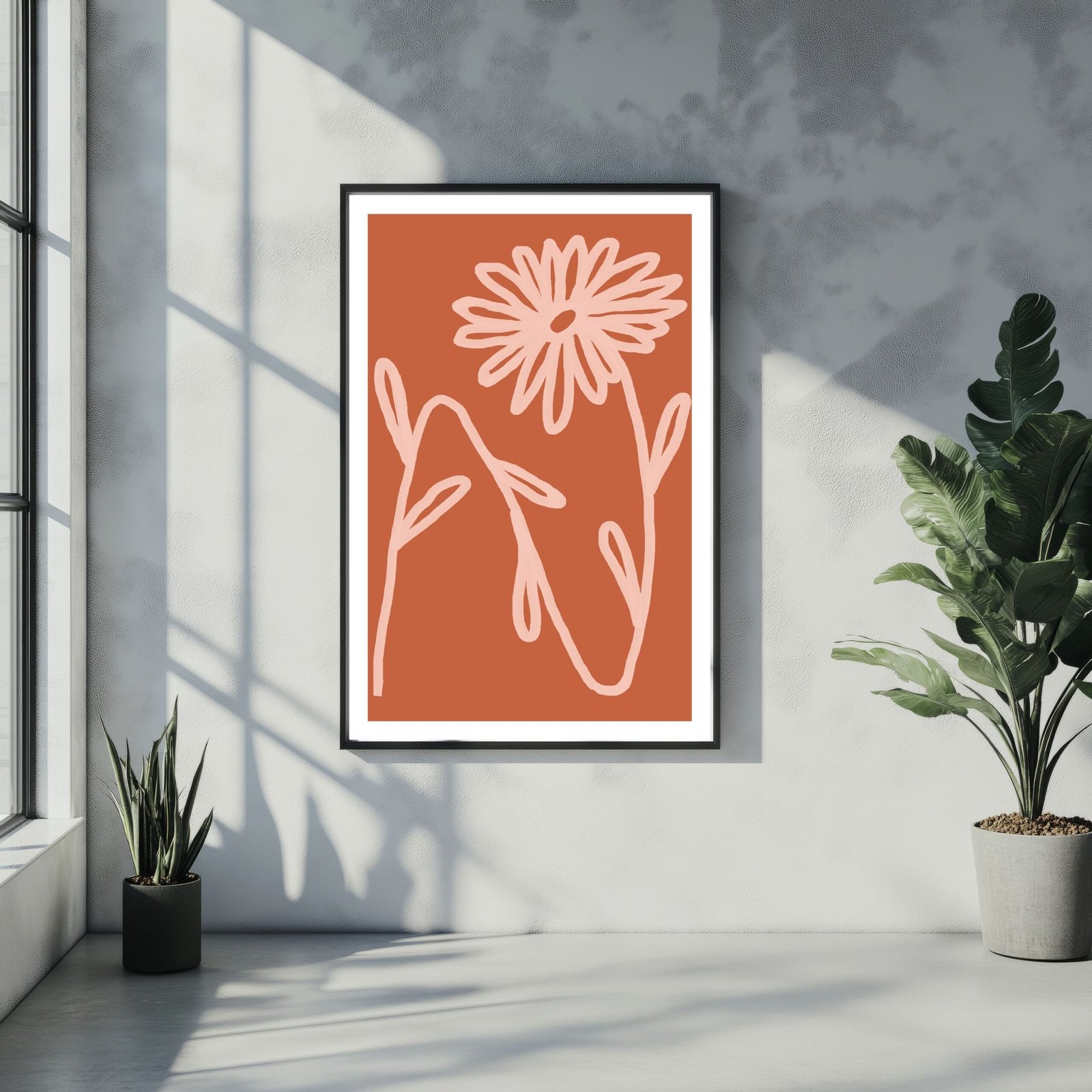 This minimalist floral artwork features a delicate, hand-drawn daisy on a terracotta background. Its simple yet striking design captures the beauty of nature, making it an ideal addition to any modern home decor. Perfect for adding a subtle touch of elegance to your wall.