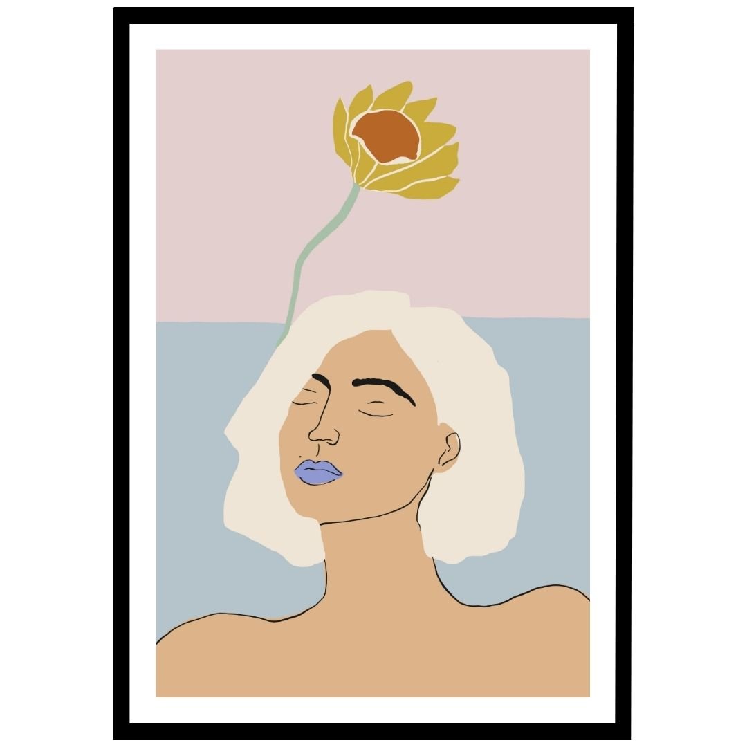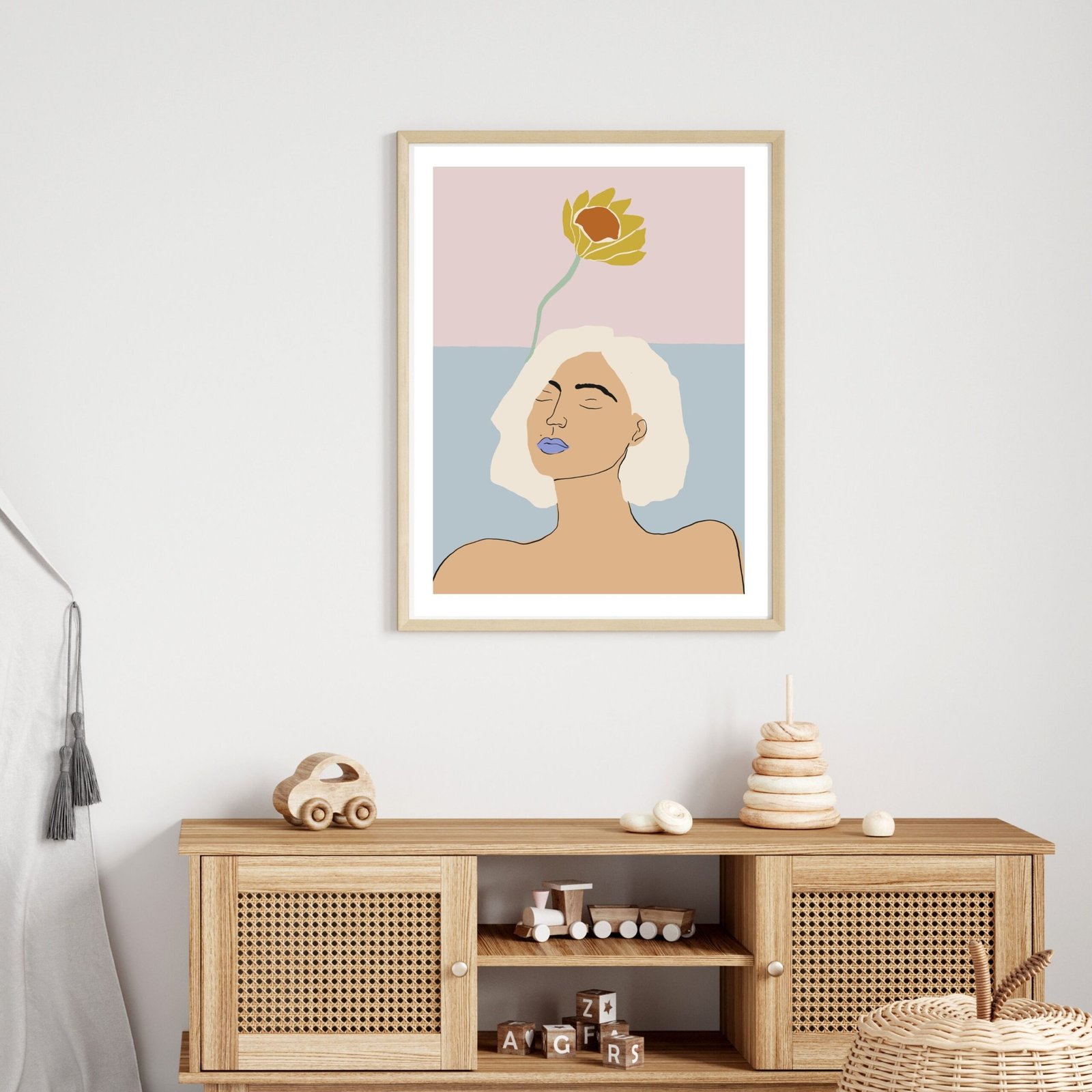 This abstract portrait features a serene face with a sunflower growing above it, set against soft pastel colours. The warm tones and unique design create a peaceful and uplifting atmosphere, perfect for adding an artistic touch to any living room or bedroom.