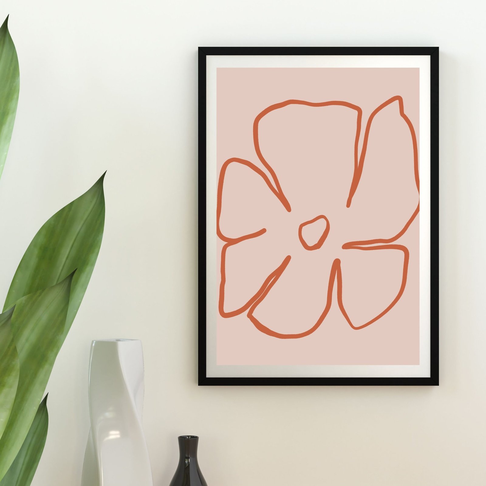 A stunningly simple yet striking piece, this minimalist flower outline poster features a delicate and bold line drawing of a flower in warm terracotta tones. The soft, muted background enhances the minimalist aesthetic, making it a timeless piece that complements modern and neutral-themed interiors.