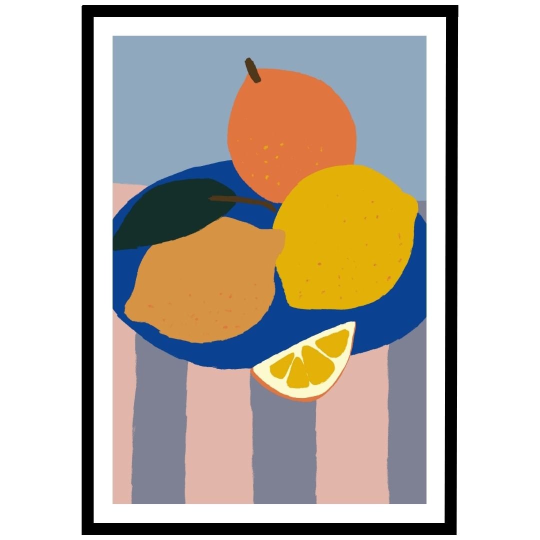 This vibrant poster features a bowl of fresh lemons and oranges against a colourful backdrop. Perfect for adding a burst of fresh, fruity energy to your kitchen, dining room, or any space in need of some lively decor.