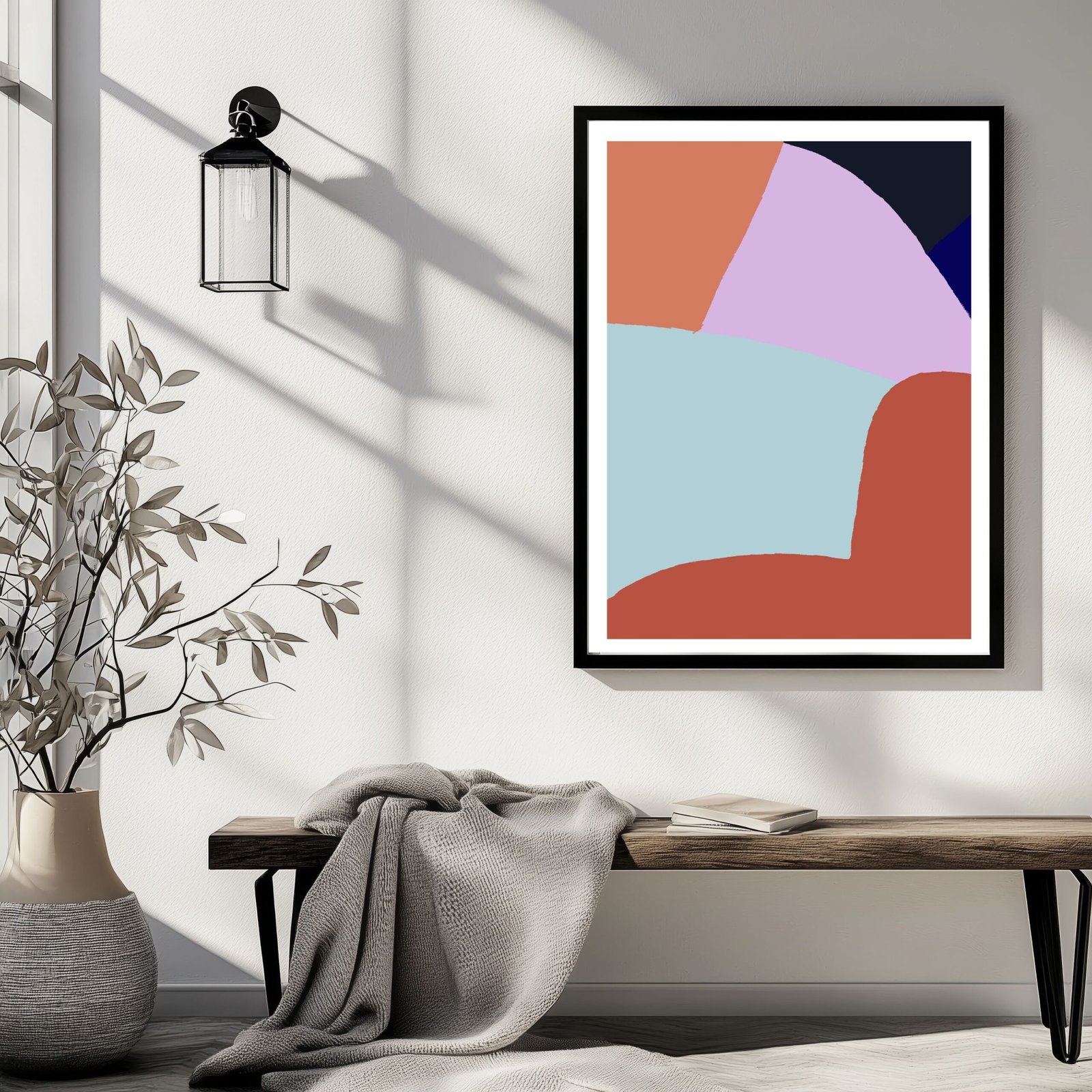 This geometric abstract wall art features blocks of colours such as burnt orange, lavender, and teal, creating an engaging yet calming atmosphere. Perfect for adding a modern and stylish touch to your living room, bedroom, or office.