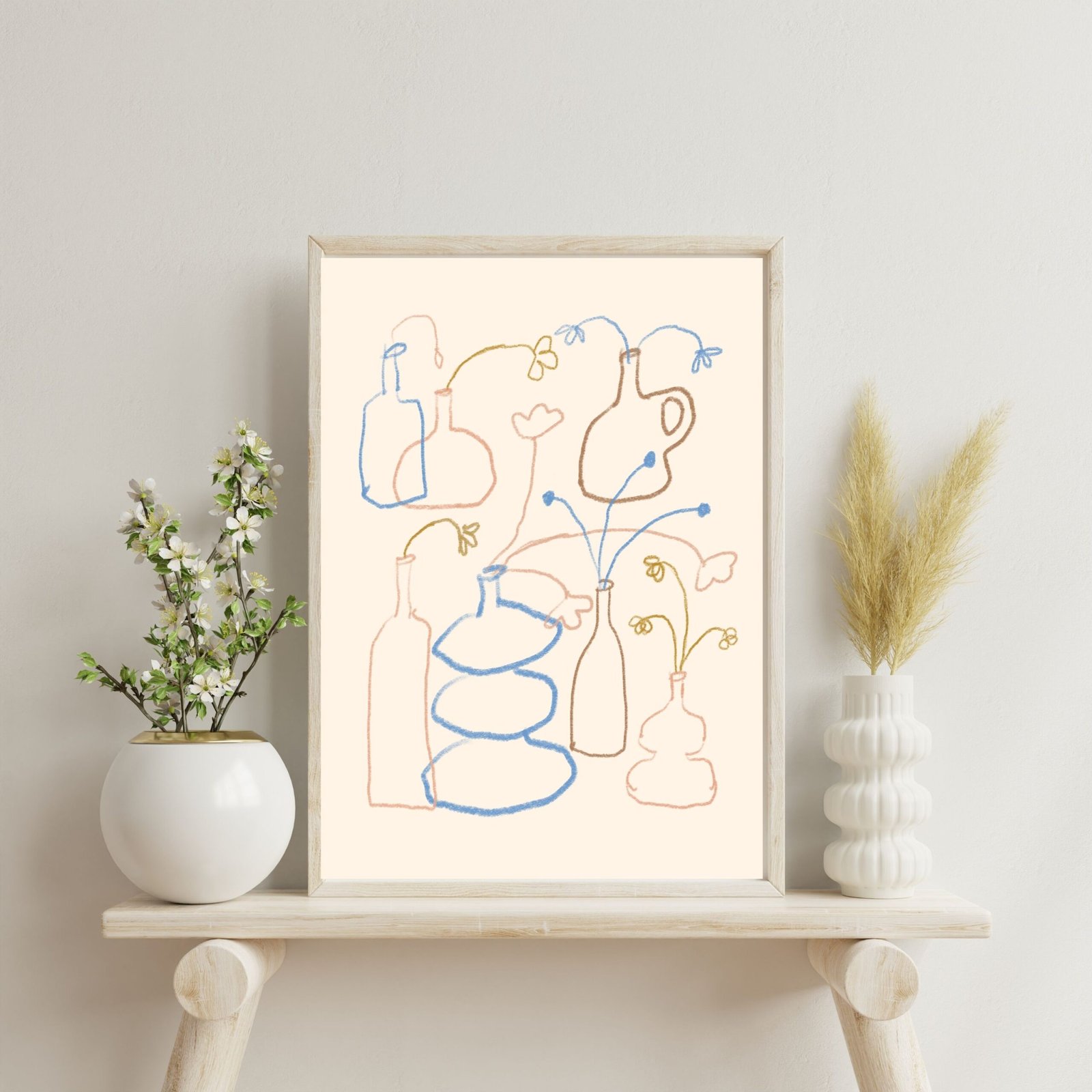 This minimalist print features a series of abstract bottles with delicate flowers, drawn in soft and calming colors. The flowing lines and simple shapes create a modern and serene aesthetic. Ideal for bringing a contemporary, artistic touch to your living room, office, or bedroom.
