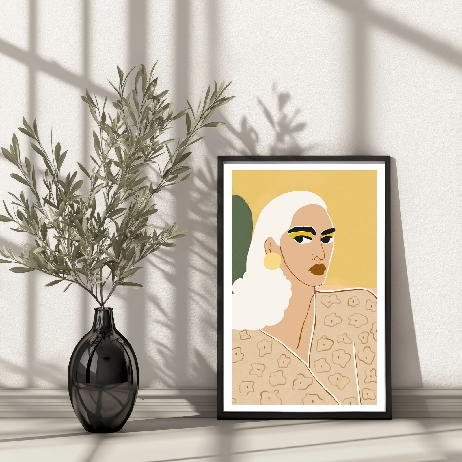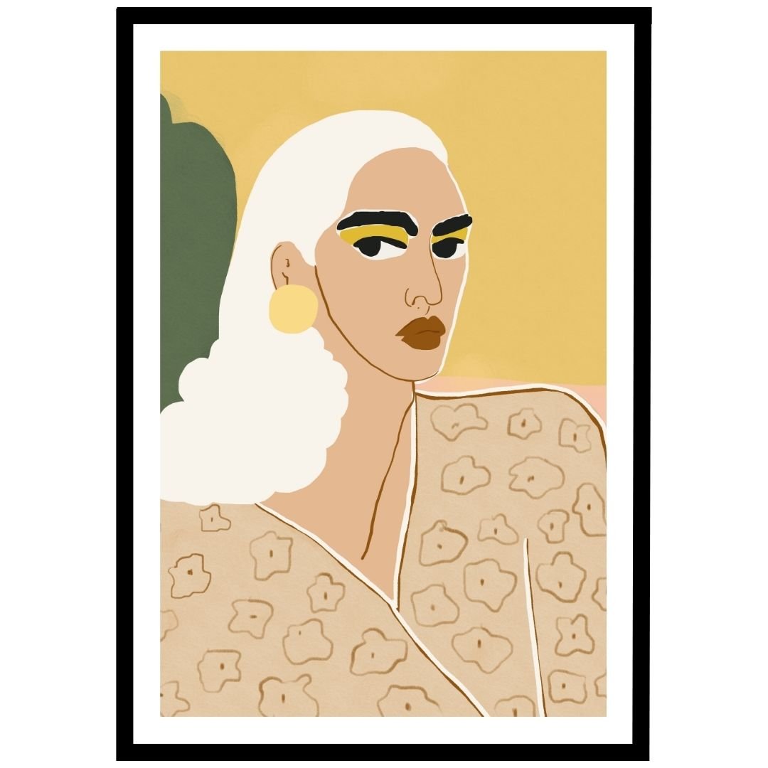 This contemporary portrait features a bold, stylised woman with flowing white hair and striking yellow earrings. The minimalist design and warm, earthy tones create a sophisticated and stylish aesthetic. Ideal for modern living rooms or bedrooms, this poster adds a chic, confident touch to any wall.