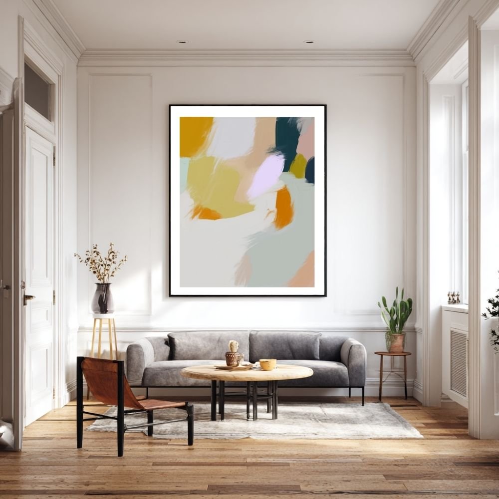 This abstract design features a variety of soft hues, including yellows, pinks, and blues. It brings an artistic touch to your home with its modern, free-flowing shapes. Ideal for living rooms, bedrooms, or workspaces that need a burst of colour and creativity.