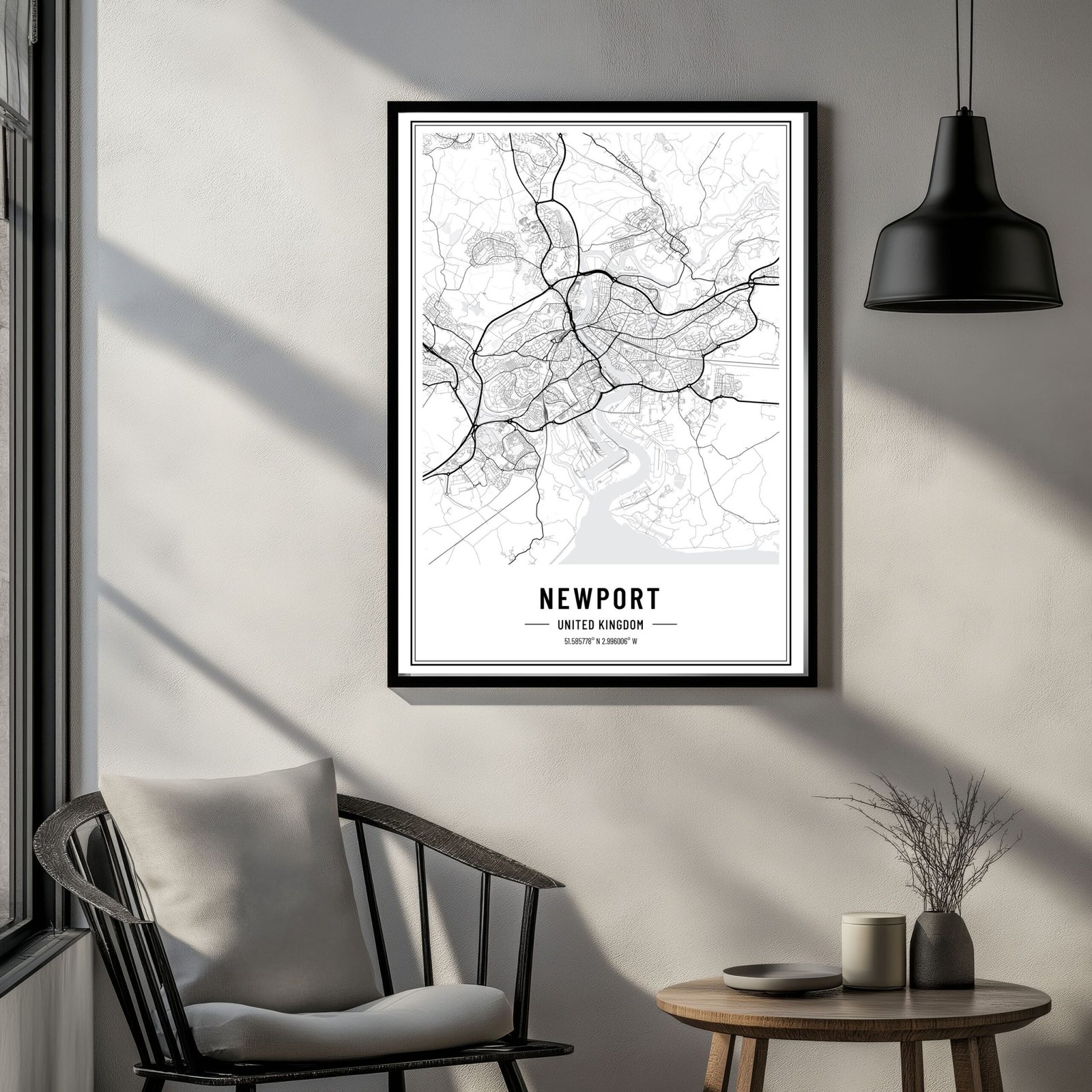 This black and white map of Newport captures the city’s special kind of charm. Designed in timeless monochrome, this artwork maps out the city’s intricate street network, key districts, and defining landmarks. The clean, minimalist aesthetic creates a sophisticated visual statement that works effortlessly in any room.
