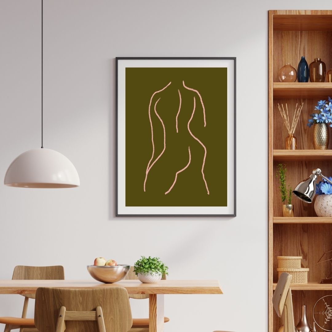 This minimalist abstract poster features the elegant curves of the human body outlined in soft peach tones on a rich olive background. The simple yet evocative design brings a sophisticated touch to any room, offering a modern twist on the classic figure drawing.