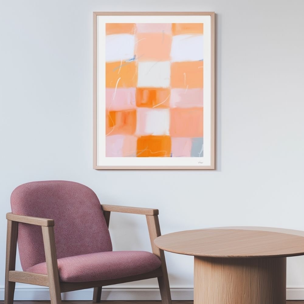 Featuring soft orange and pink tones, this abstract squares poster is a playful and modern addition to any space. Its bold, energetic design makes it perfect for kitchens, living rooms, or creative workspaces that need a burst of colour.