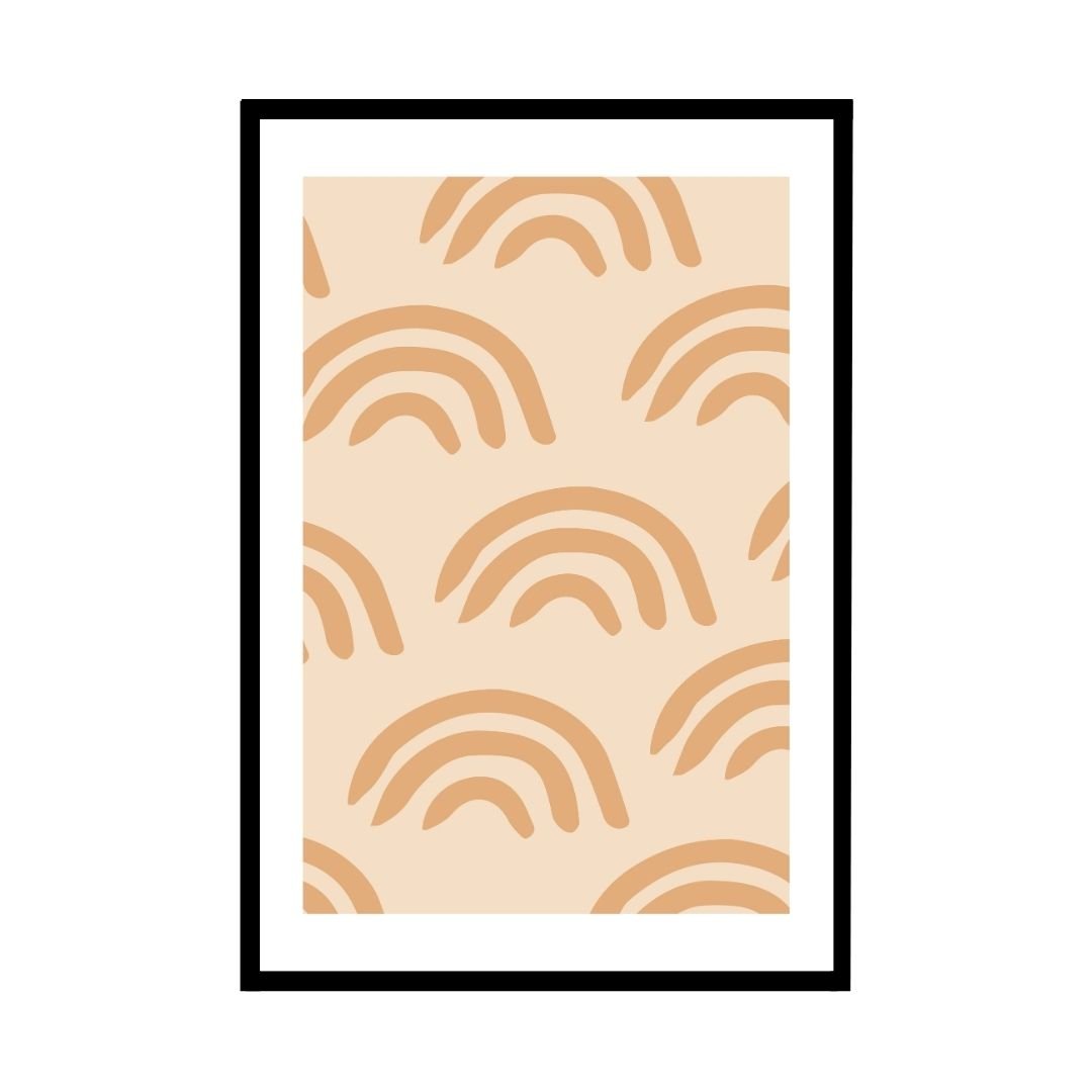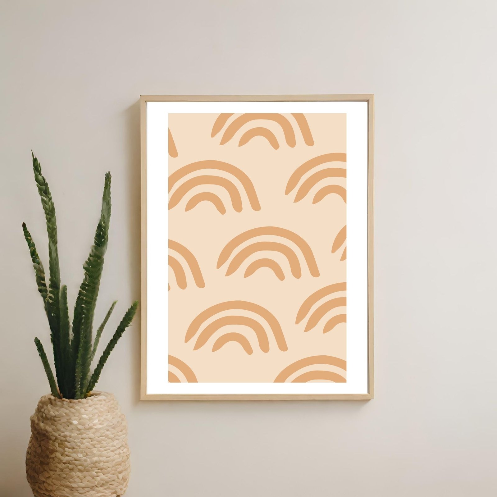 This peachy rainbow art print features soft, curved arches in gentle peach tones, adding a serene and playful vibe to any room. The minimalist design is perfect for modern and boho-inspired interiors, providing a touch of whimsy and warmth.