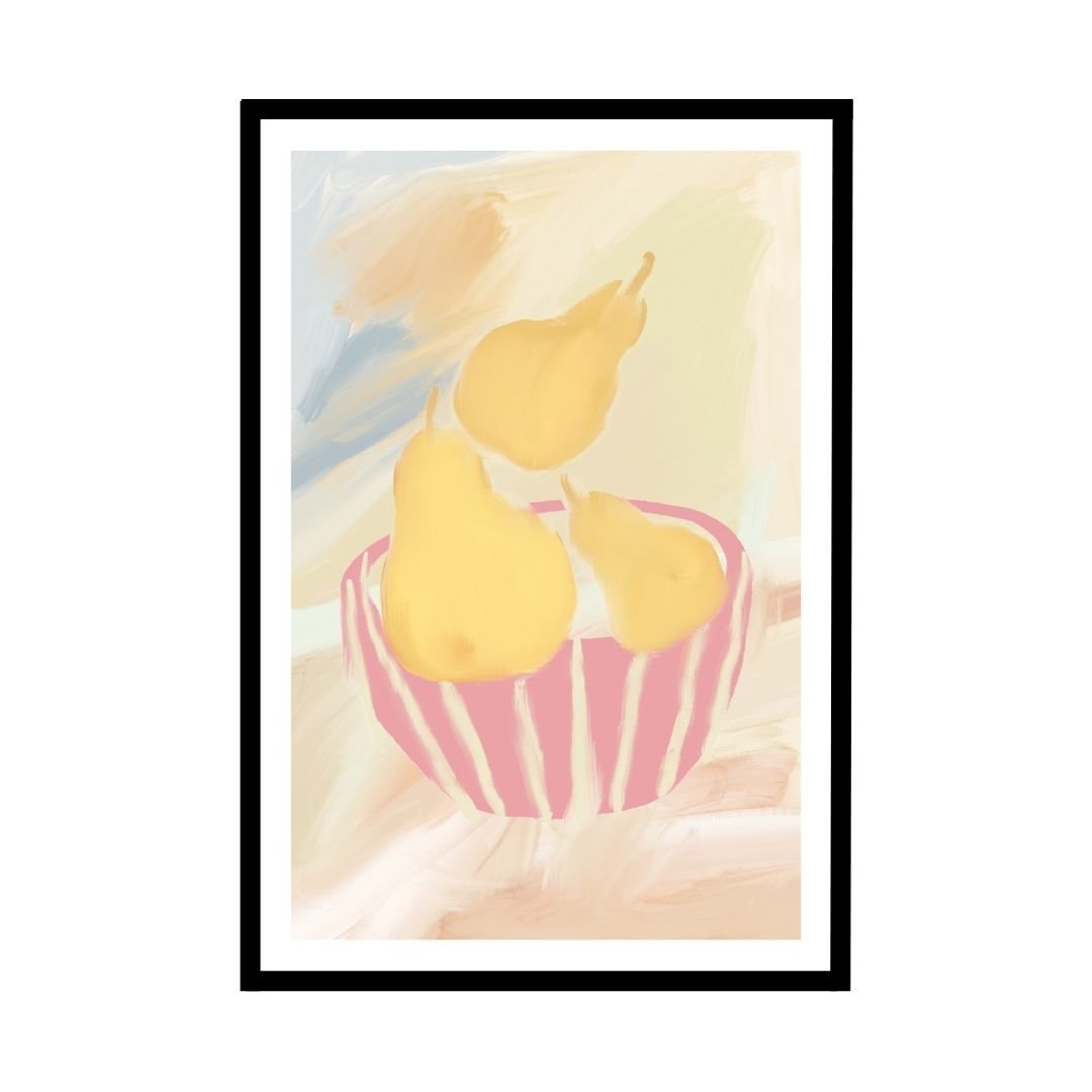 This charming art print showcases a bowl of bright yellow pears set against a pastel backdrop. The striped bowl and soft colours create a fresh, inviting atmosphere, perfect for kitchens, dining rooms, or spaces in need of a warm, natural touch.