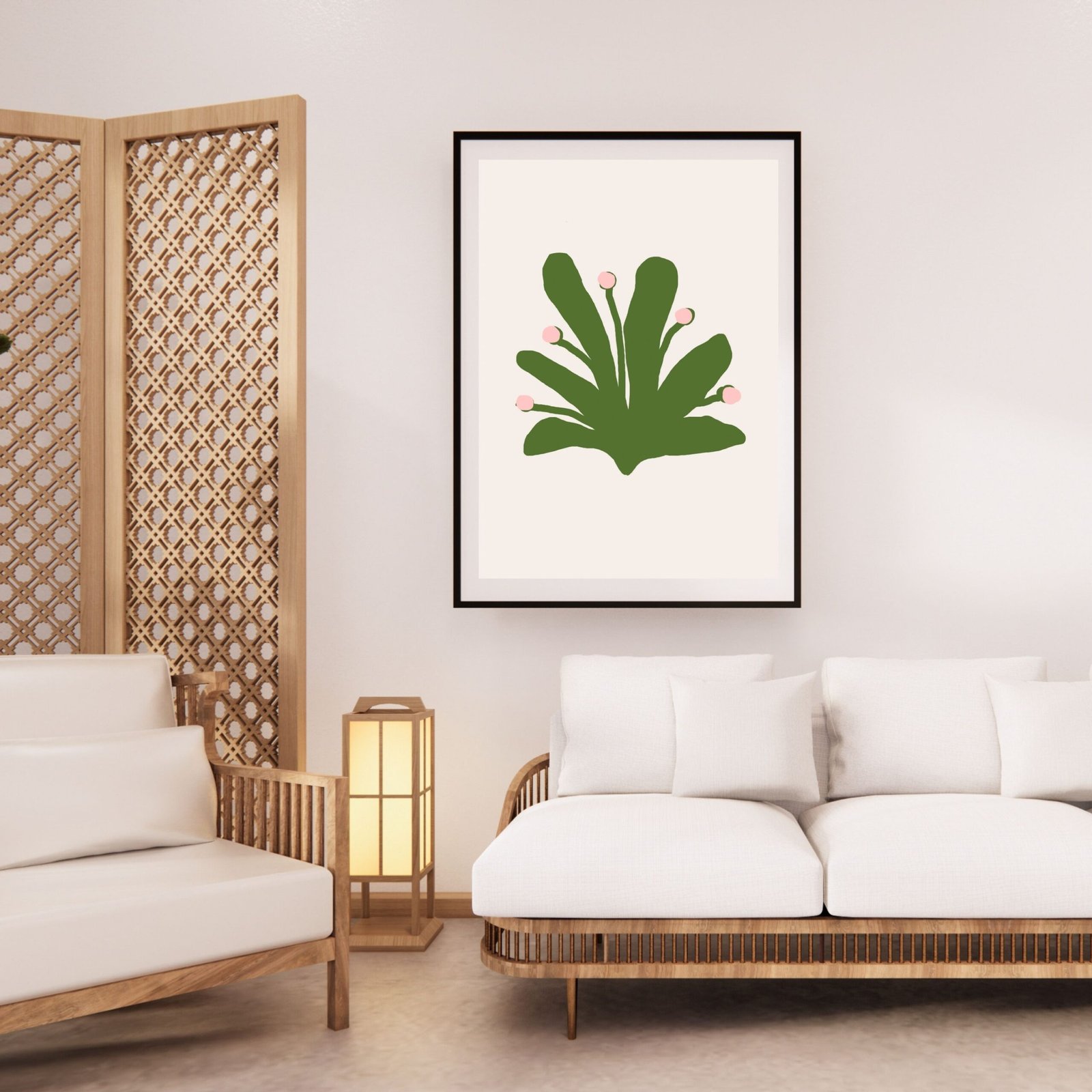 This artwork showcases a vibrant green plant design with soft pink buds, creating a fresh and lively feel. The soft tones of this piece make it ideal for any room that needs a dash of nature-inspired elegance and warmth.