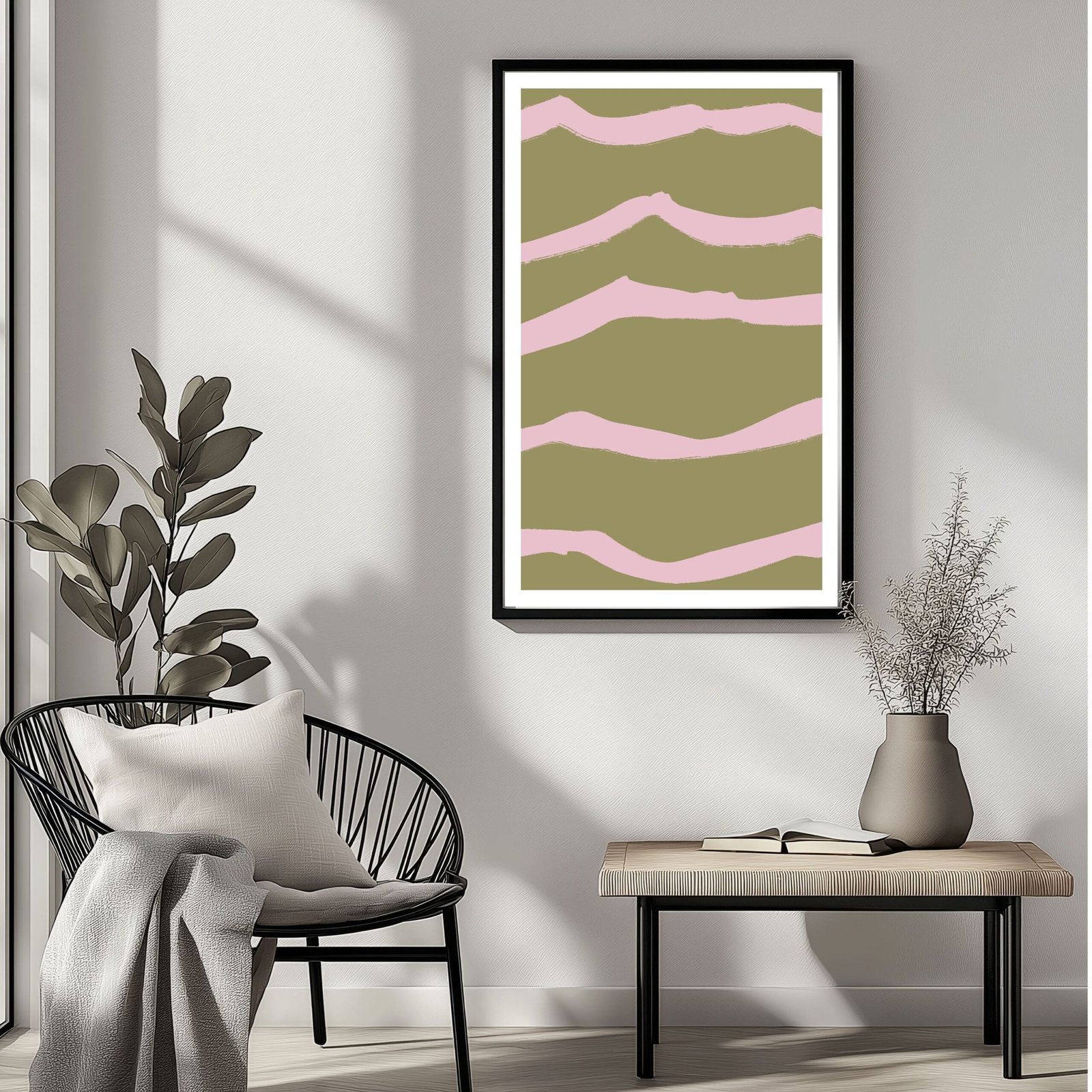 This modern art piece combines soft pink and green stripes, creating a calming and stylish look. Its abstract design is perfect for contemporary home offices, living rooms, or as a statement piece in any room.
