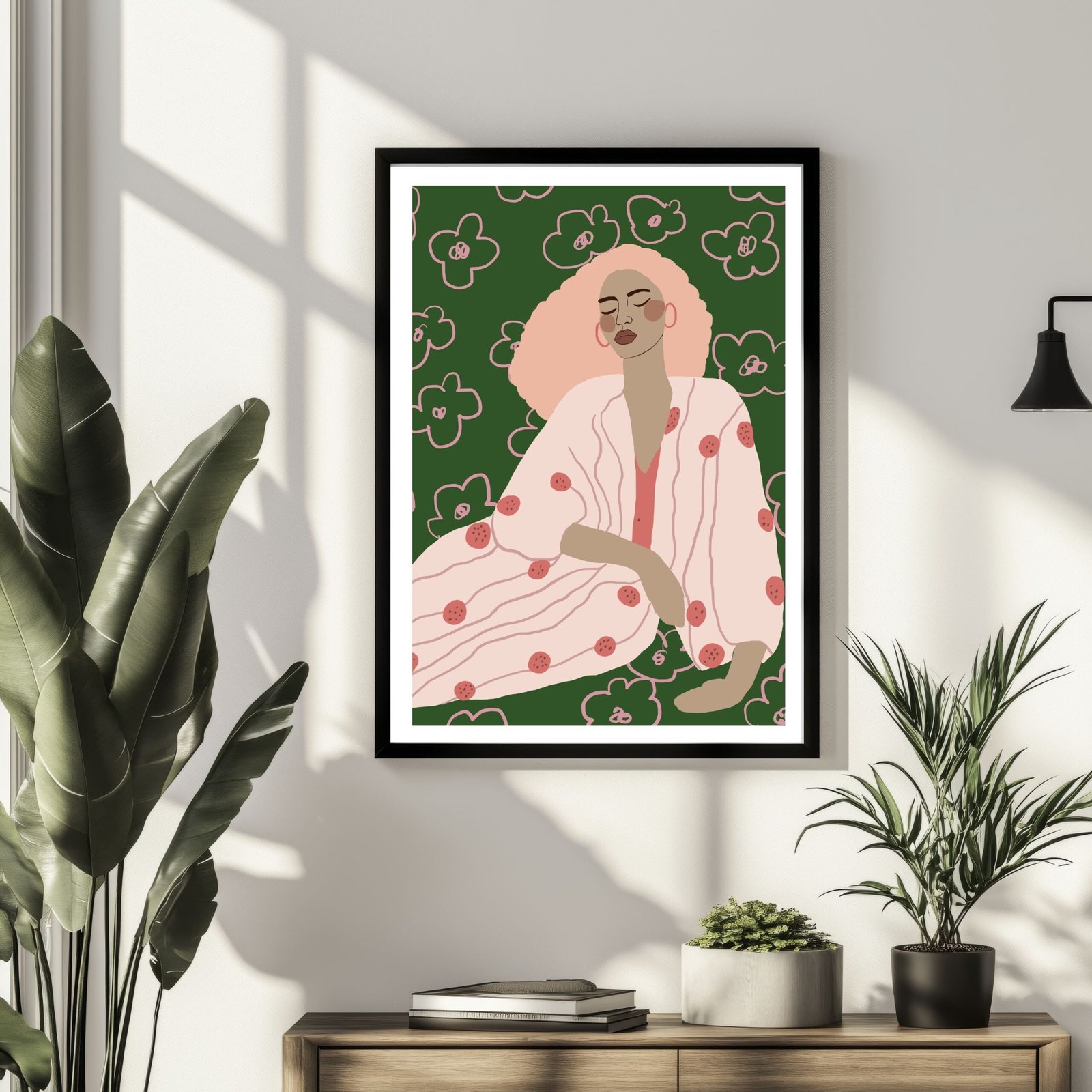 This striking wall art features a woman with pink curly hair dressed in a floral kimono, set against a vibrant green background. The bold design is perfect for adding personality and colour to modern living spaces or bedrooms.