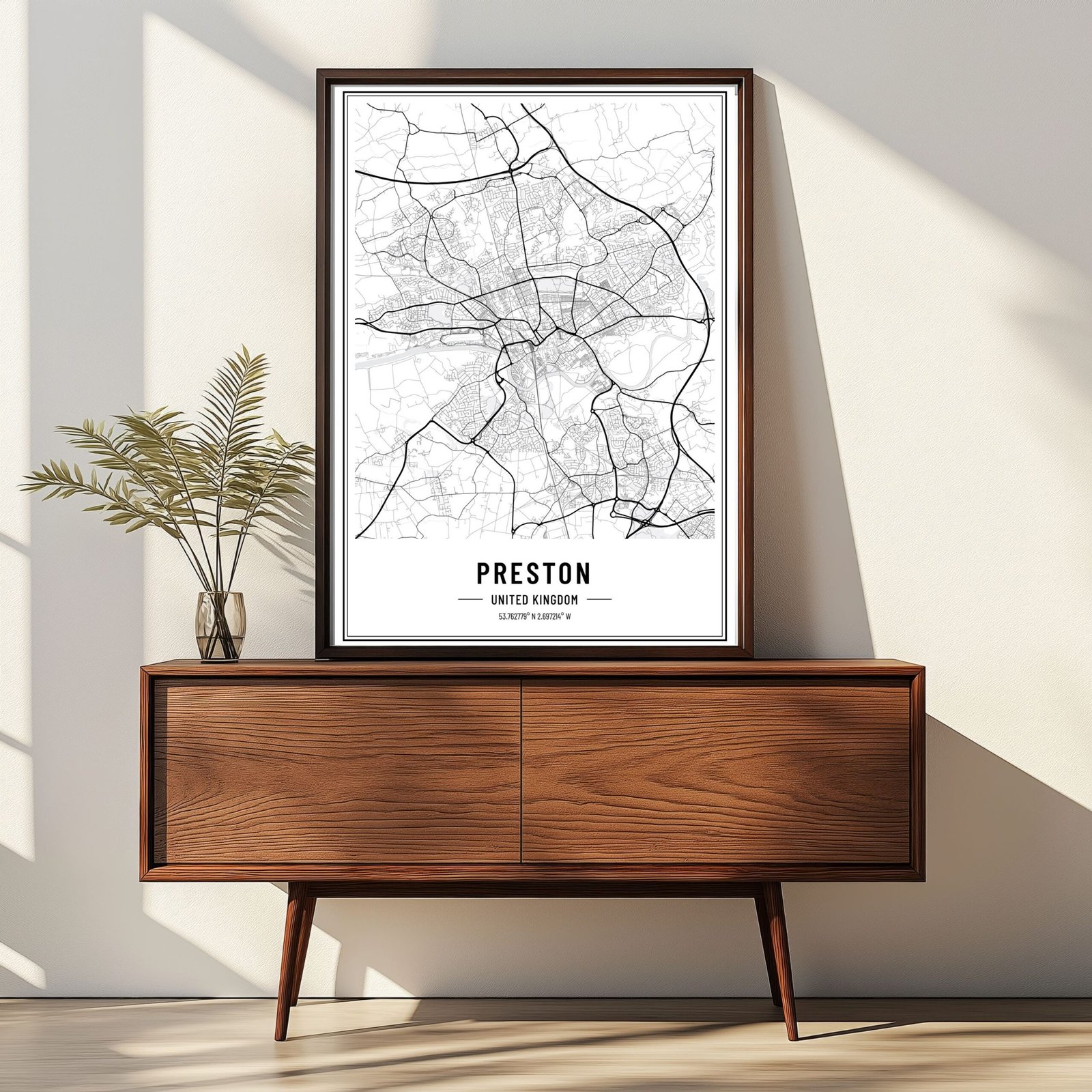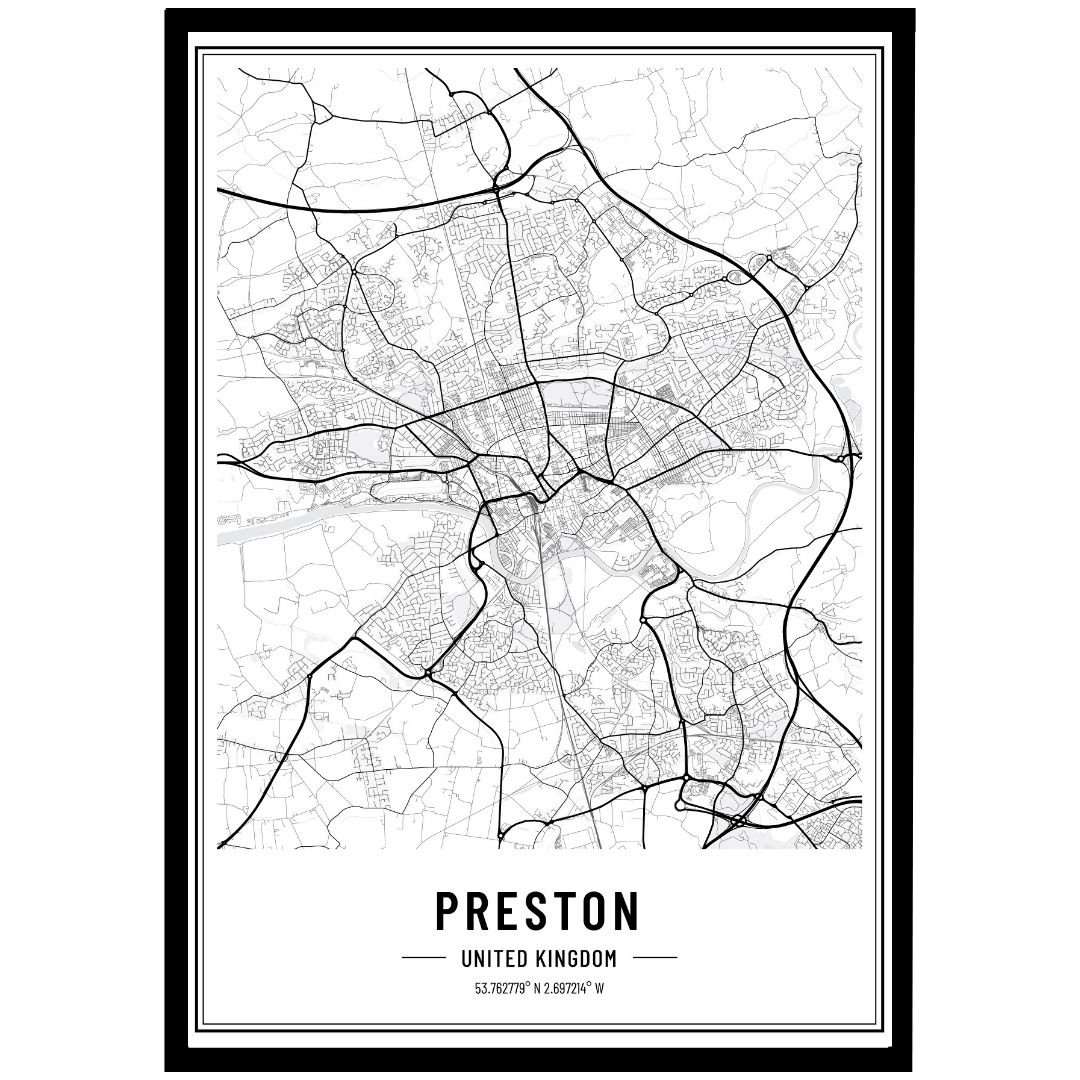The Black and White Map of Preston is a stylish and detailed wall art print. It captures Preston’s streets, layout, and landmarks in elegant monochrome. Each line highlights the city’s unique character and charm.