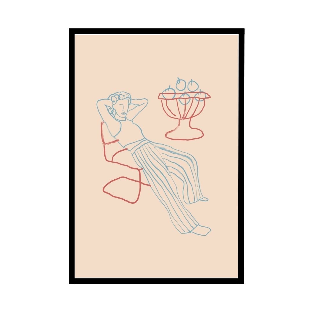 Add a pop of colour to your space with this retro lounge chair artwork. Featuring a contemporary line drawing of a person relaxing in a chair, this piece captures a laid-back, stylish vibe. The soft pastel hues of red and blue create a soothing and fashionable atmosphere for your home.