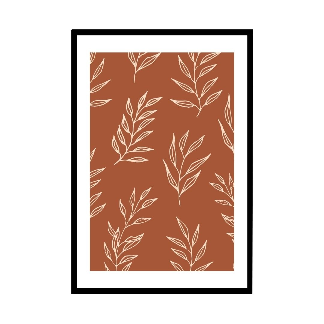 This rustic terracotta leaf print features delicate white leaf outlines against a warm terracotta background, creating a stunning contrast that adds depth to any room. The organic yet minimalist design evokes a sense of calm and nature, making it a perfect choice for a variety of interiors, from rustic to contemporary.