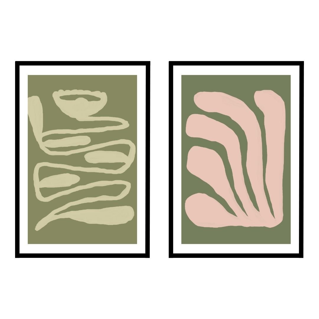 Elevate your walls with this modern Set of 2 Art Prints Organic Shapes in Muted Colors on Green Background. Designed with soft organic shapes in muted tones, each piece is set against a calming green background for a balanced, contemporary look. Perfect for living rooms, bedrooms, or offices, these prints bring a touch of minimalist sophistication and modern artistry to any space.