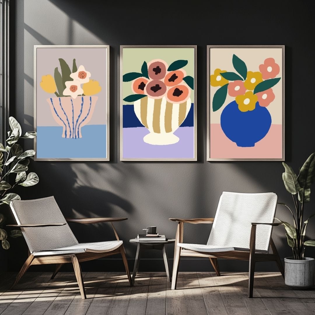 Add charm and colour to your walls with this set of three framed abstract floral art prints. Each piece features a modern vase with flowers in soft, vibrant tones, blending contemporary design with natural beauty. Perfect for living rooms, bedrooms, or offices, this set creates a fresh and artistic focal point in any space.