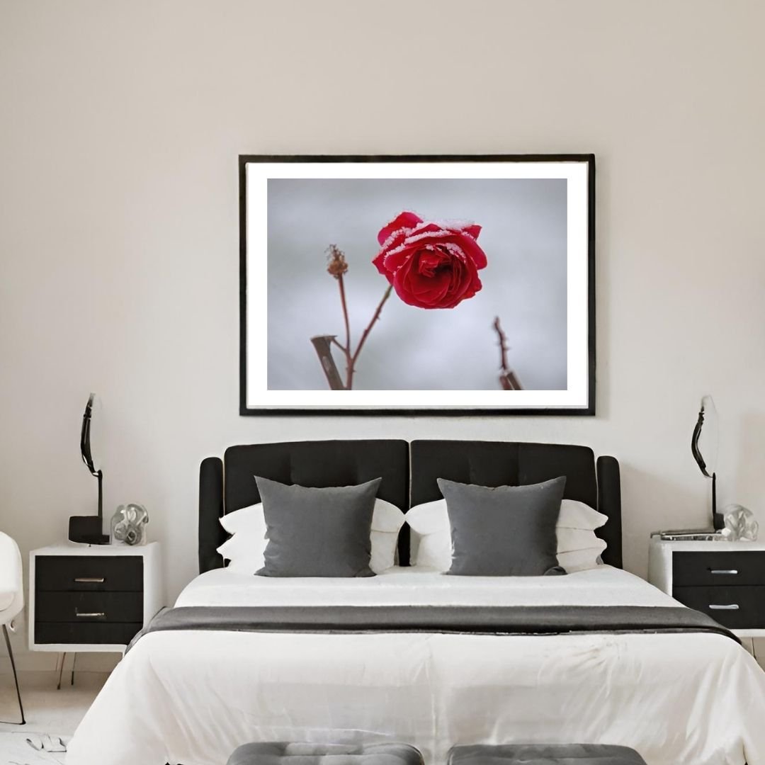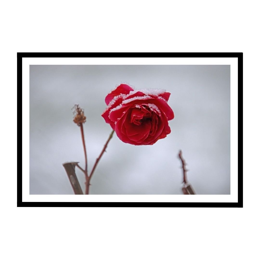 Our Snowy Single Rose print will help you remember the peaceful magic of winter. This beautiful piece has a single rose with a light covering of snow. An impressive sign of strength, beauty, and stillness. Perfect for simple rooms, romantic settings, or anyone who likes flower art with a seasonal twist.