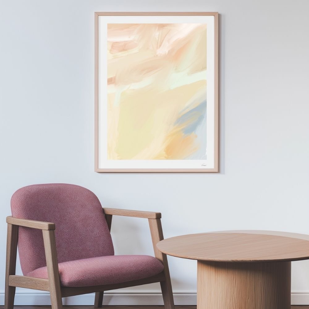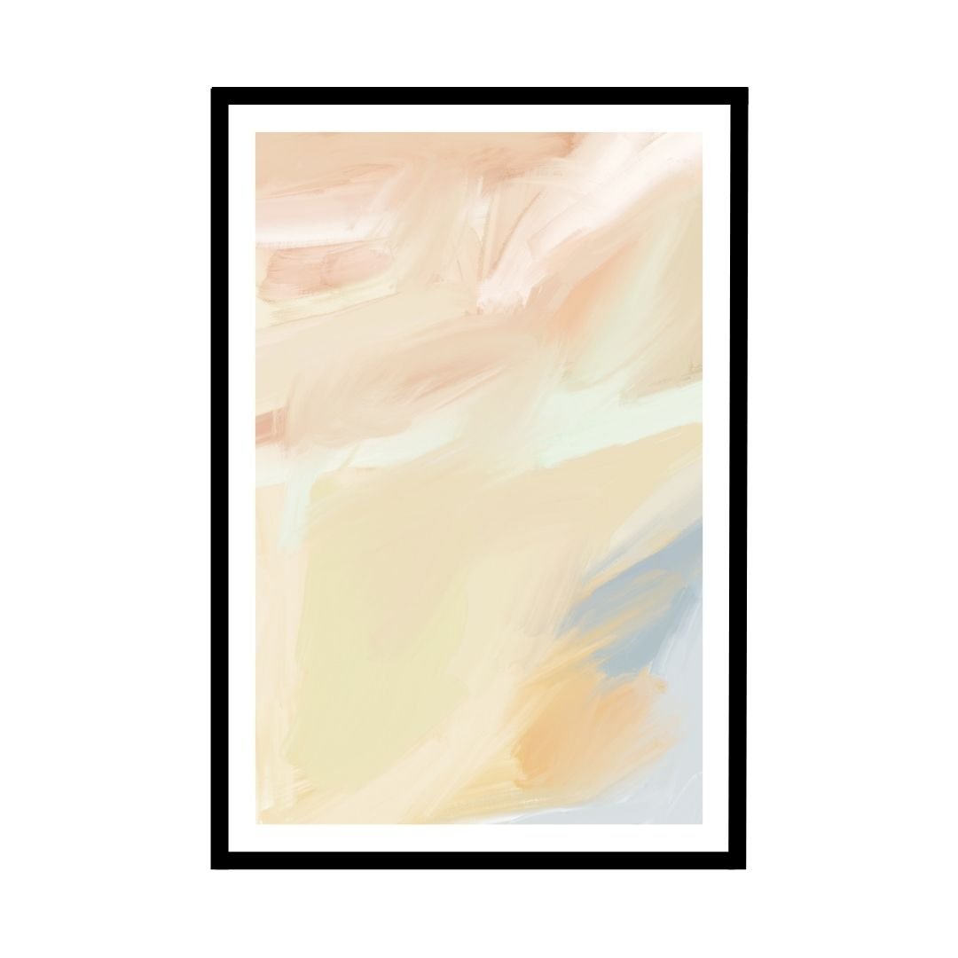 This soft pastel abstract poster features calming hues of peach, blue, and cream. The gentle brushstrokes blend harmoniously, creating a serene and tranquil atmosphere. Ideal for bedrooms or living rooms, this piece will bring a touch of subtle elegance to your space.