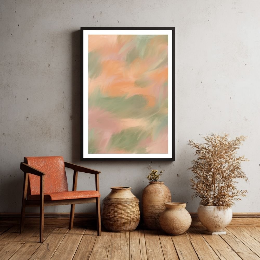 This soft and soothing abstract poster features peach, green, and cream hues blended together with soft brushstrokes. Its gentle tones make it an excellent choice for creating a relaxed, calm atmosphere in living rooms or bedrooms.