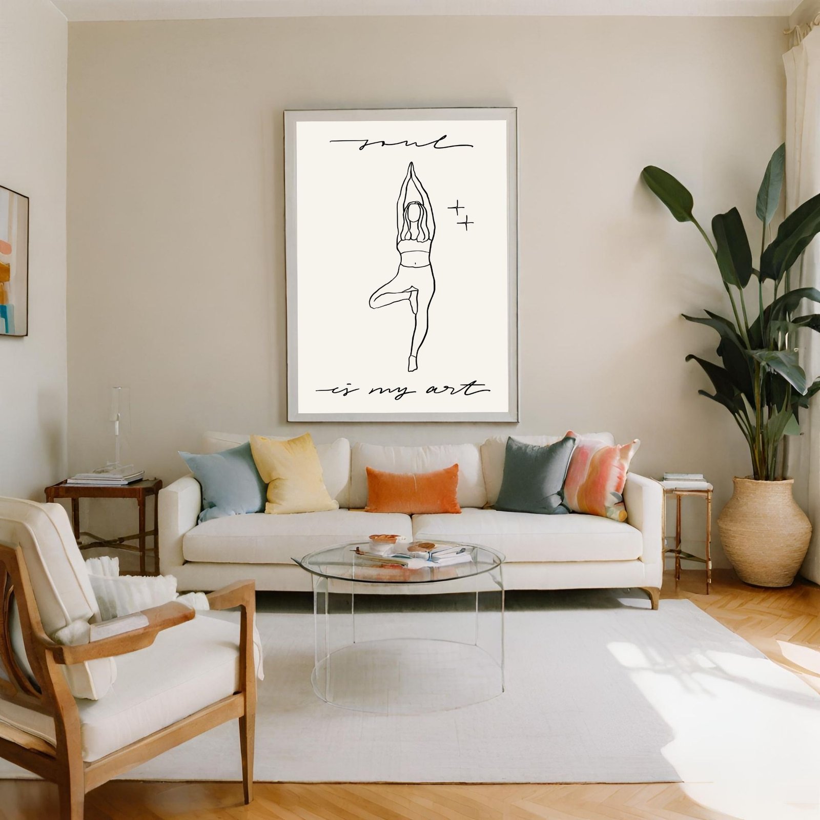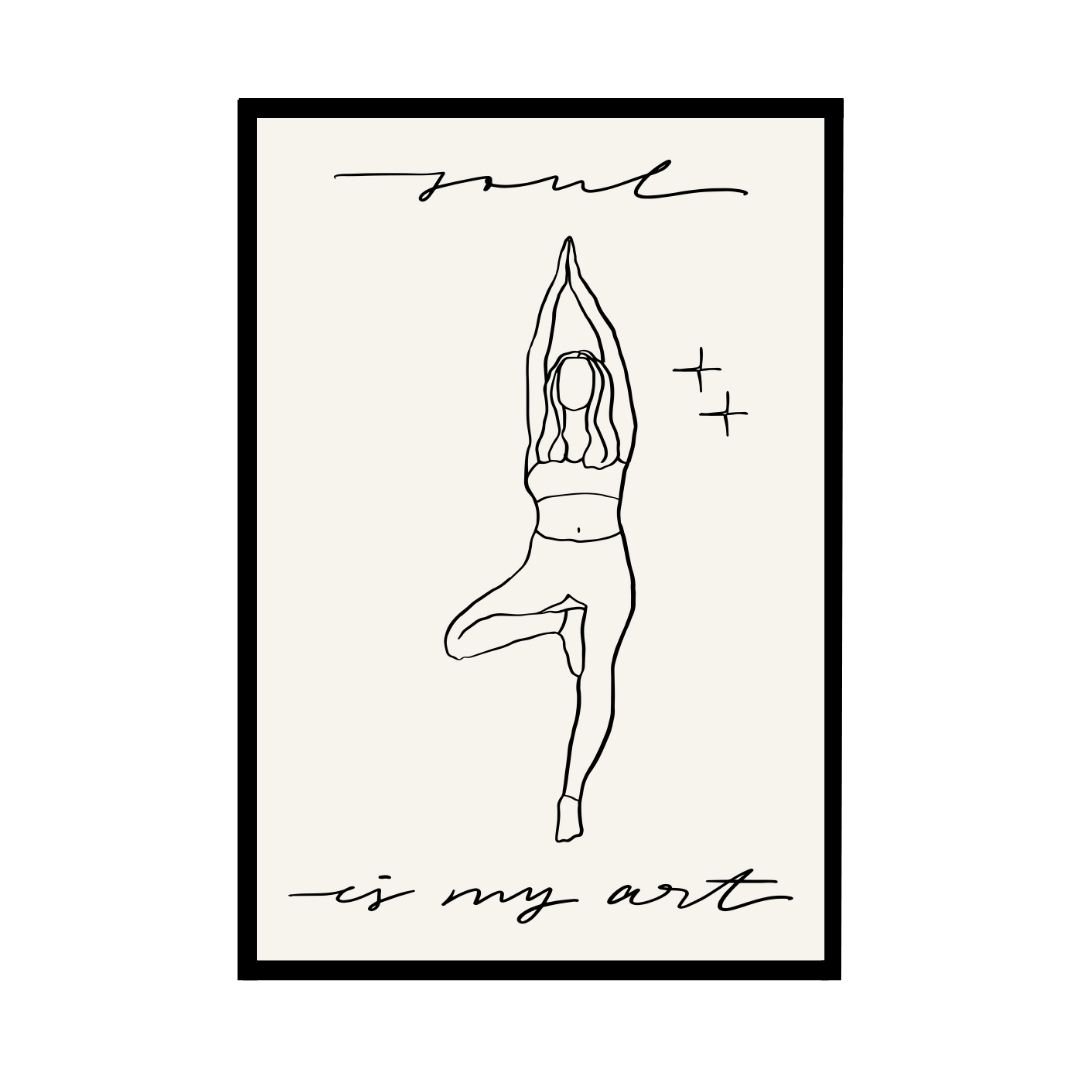 The Soul is My Art Yoga Poster embodies the connection between yoga and creativity. Featuring a graceful yoga pose with a focus on the body and spirit, this minimalist line art piece is perfect for any yoga enthusiast or art lover. It inspires strength and balance, making it a great addition to your wellness collection.