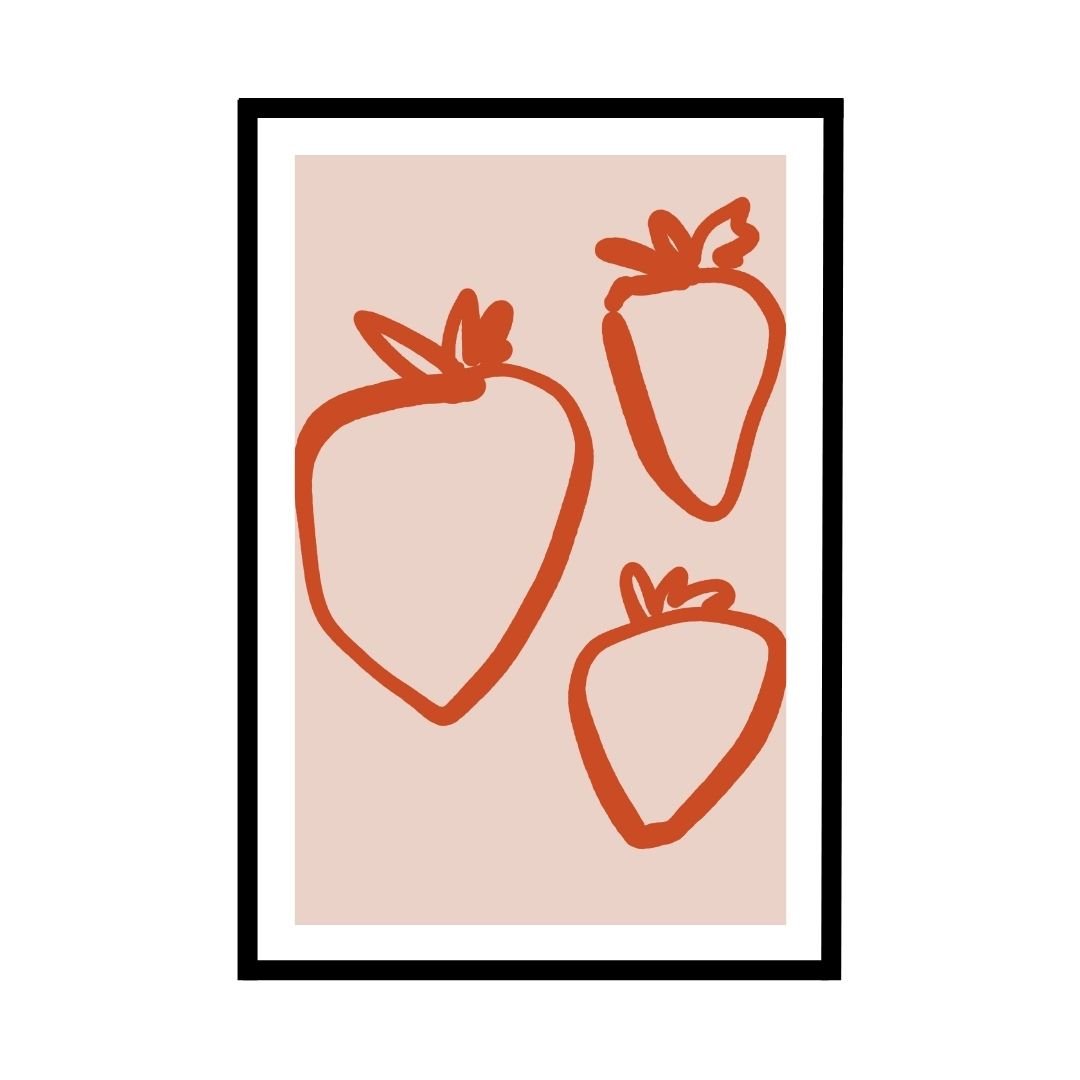 This abstract poster features outlined strawberries in a bold orange hue against a soft beige background. It’s a perfect choice for a modern kitchen, dining area, or any space needing a playful yet minimalist touch of colour.