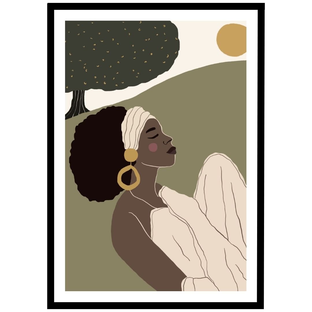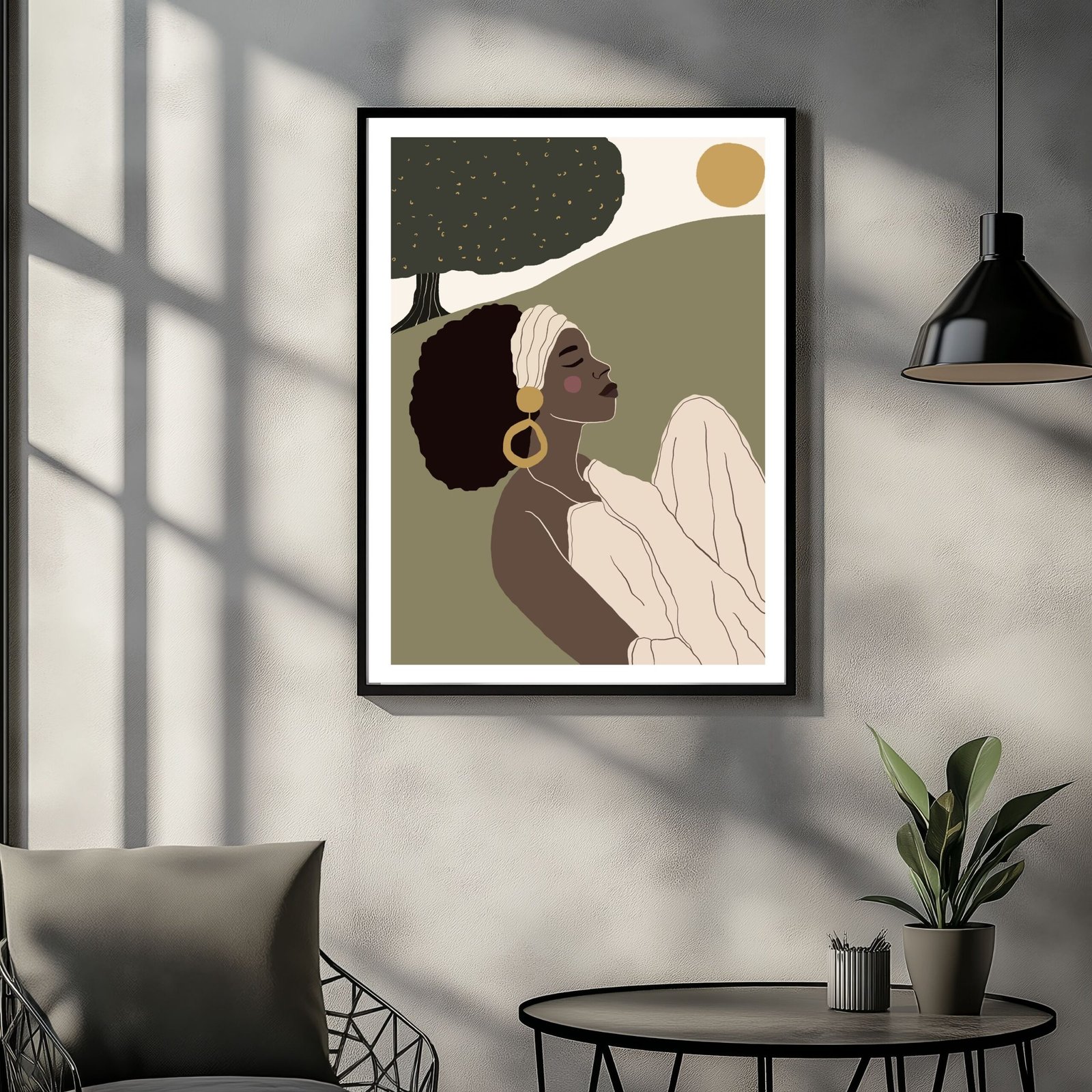 This stunning wall art features a peaceful, serene woman with a headscarf, lounging under a tree as the sun sets. The muted colour palette creates a calming atmosphere, making it perfect for enhancing any living space. Ideal for bedrooms or meditation corners, this piece adds a touch of relaxation and natural beauty to your home.