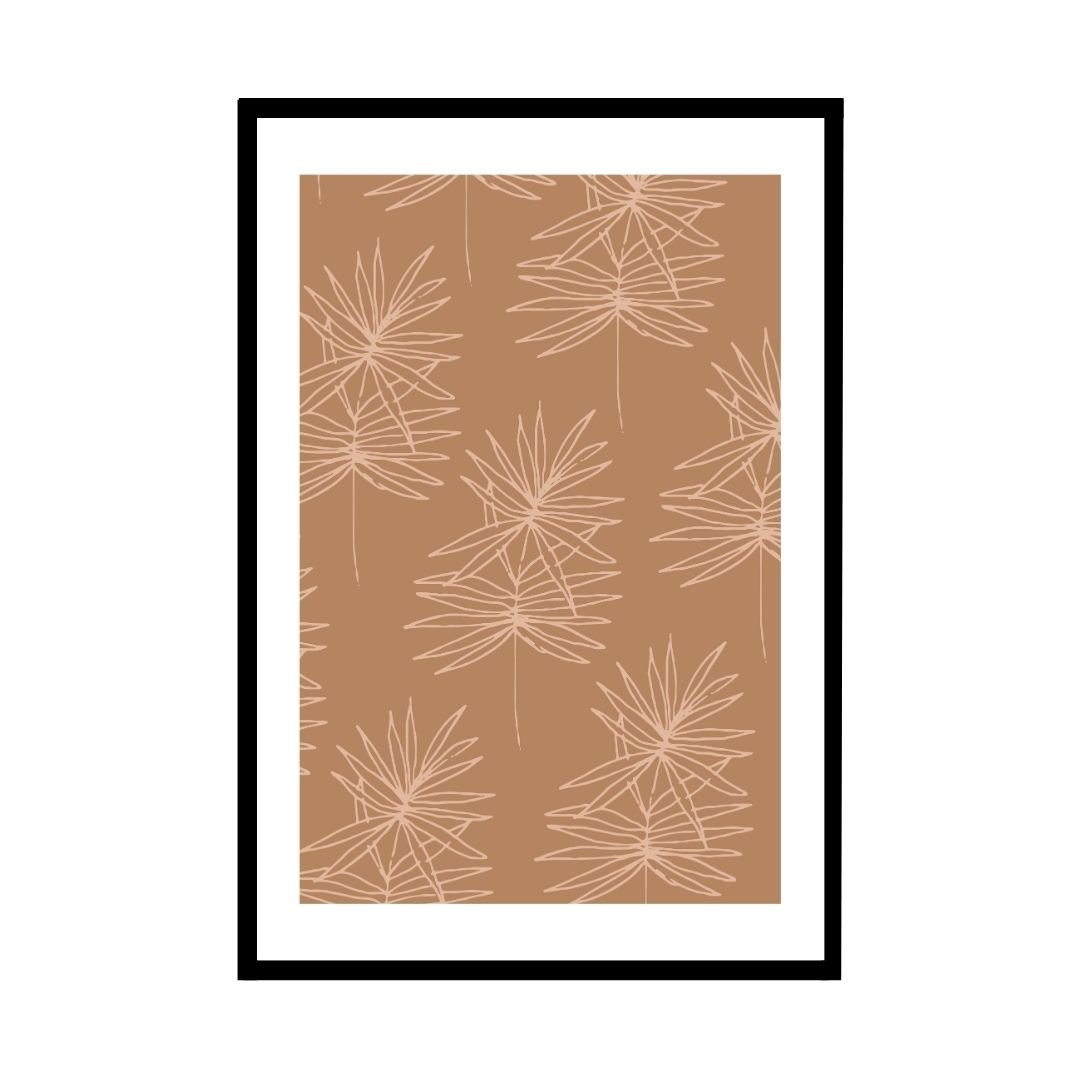 This tropical palm leaf line art print captures the beauty of nature through elegant, minimalist lines. Set against a rich brown background, the soft peach-colored leaves create a striking contrast, offering a warm and organic feel. This print is perfect for adding a calm, tropical vibe to your living room, bedroom, or office.