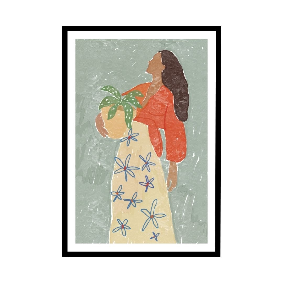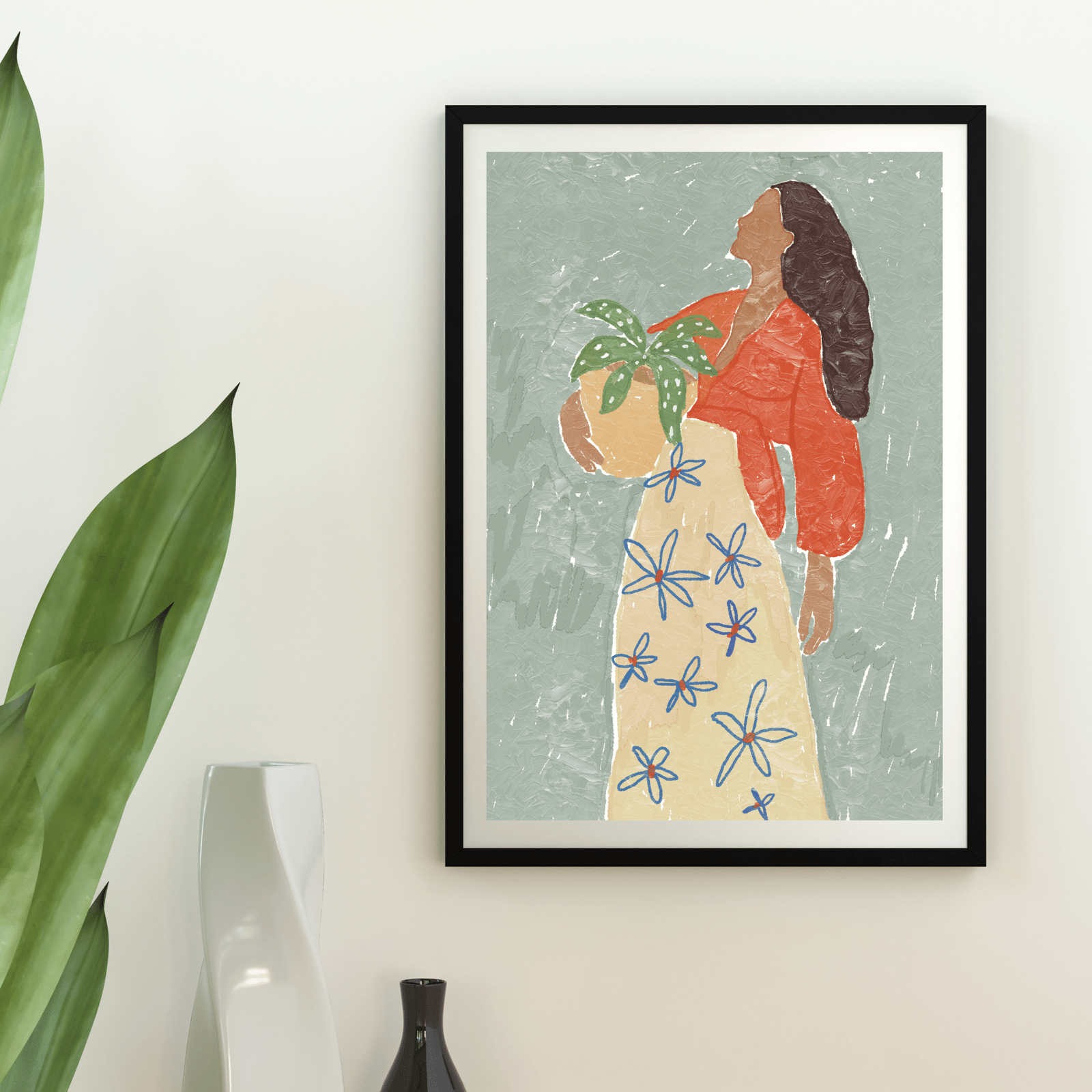 This vibrant art print features a woman in a bright red top and floral skirt, holding a potted plant. The warm, earthy tones and playful design bring a cheerful, bohemian vibe to any room, perfect for nature lovers or contemporary spaces.