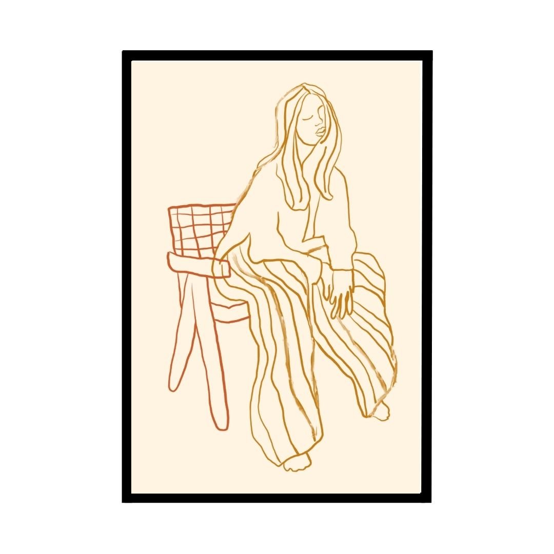 This minimalist line art poster captures the serene elegance of a woman sitting, with a simple yet impactful design. The warm terracotta tones and delicate lines create a calm and sophisticated atmosphere, making it an ideal piece for any modern living space or bedroom.