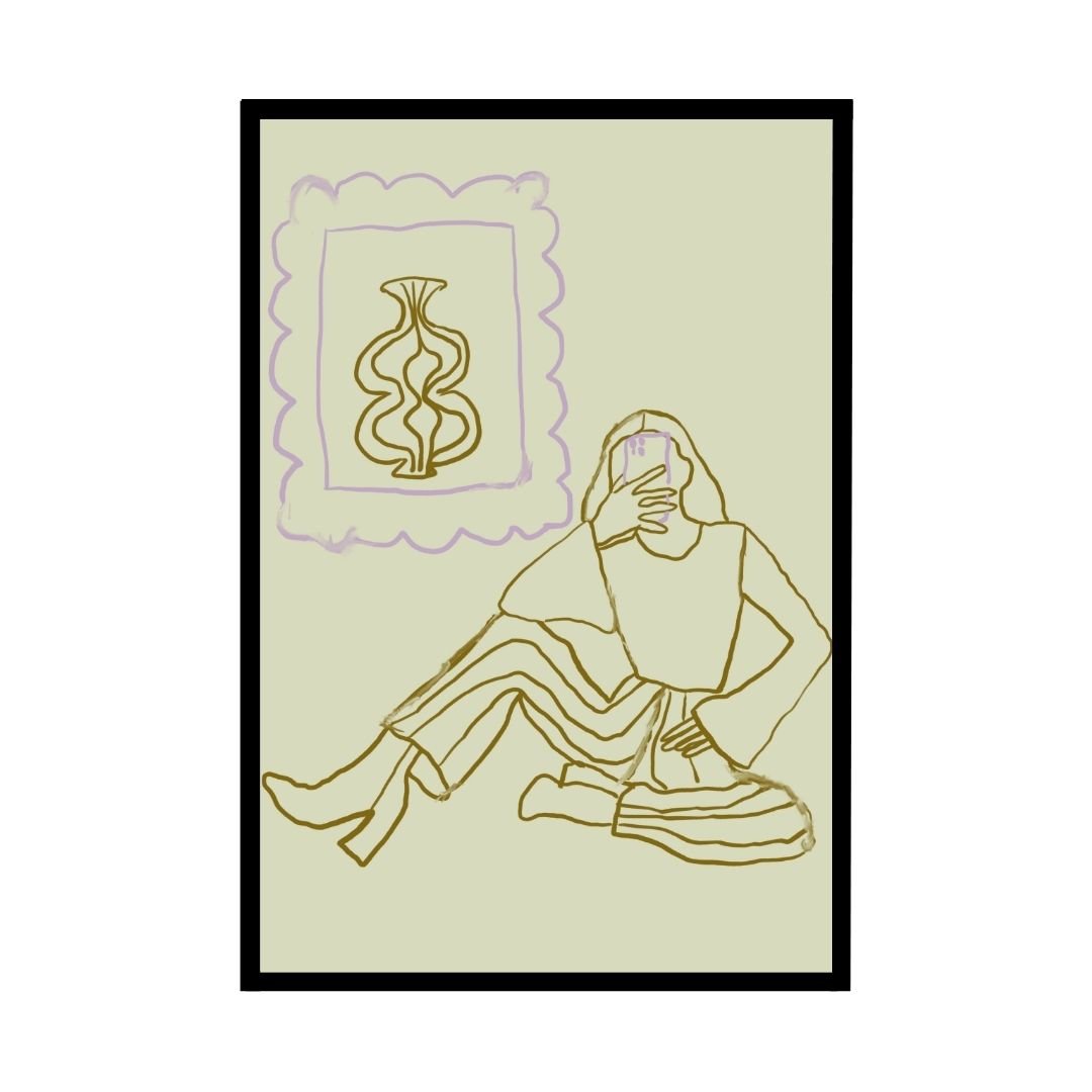 This contemporary artwork features a woman in a relaxed pose, with an elegant touch of art displayed on the wall behind her. The soft green background and golden outline bring a peaceful and sophisticated vibe to your space. Ideal for adding a modern artistic flair to your home or office.