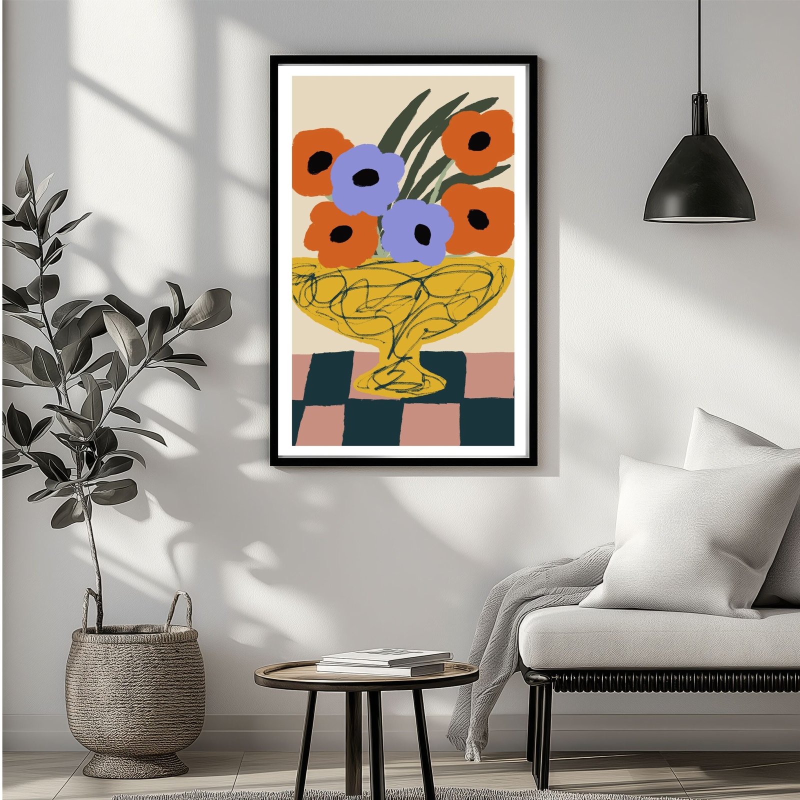 This wall art features vibrant yellow vase with colourful flowers arranged arranged in the vase, set against an abstract background. The unique design and playful patterns make it perfect for adding a modern and artistic flair to any UK home.