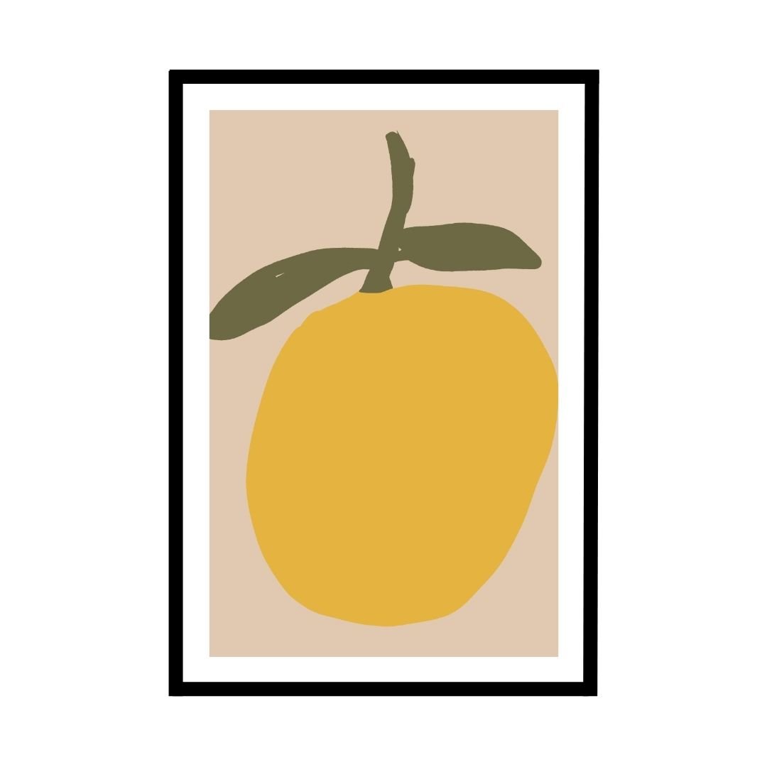 This playful and minimalist wall art features a bold yellow fruit with green leaves, set against a soft beige background. The simple yet striking design adds a pop of colour and cheer to kitchens, dining areas, or modern living spaces.